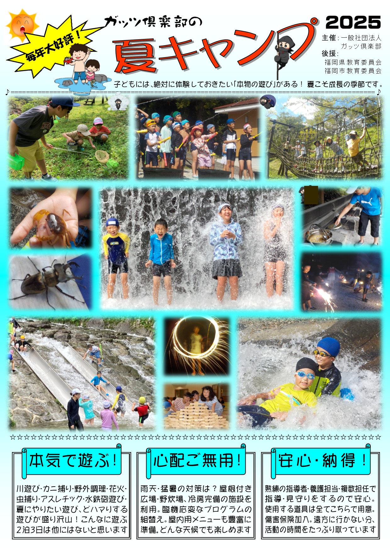 ◎参加費が安い・・・ガッツ倶楽部の夏キャンプは、近場で夏の思い出に残る楽しいことを存分に!のスタンスで良心価格。でもプログラムの充実度と子ども達の安全確保には一切手を抜いていません。子ども8人にスタッフ1人がついてお世話します。万一の際の傷害・賠償保加入費も参加費に含まれています。当然、その内容の良さが認められて14年連続の教育委員会の後援事業となっています。
