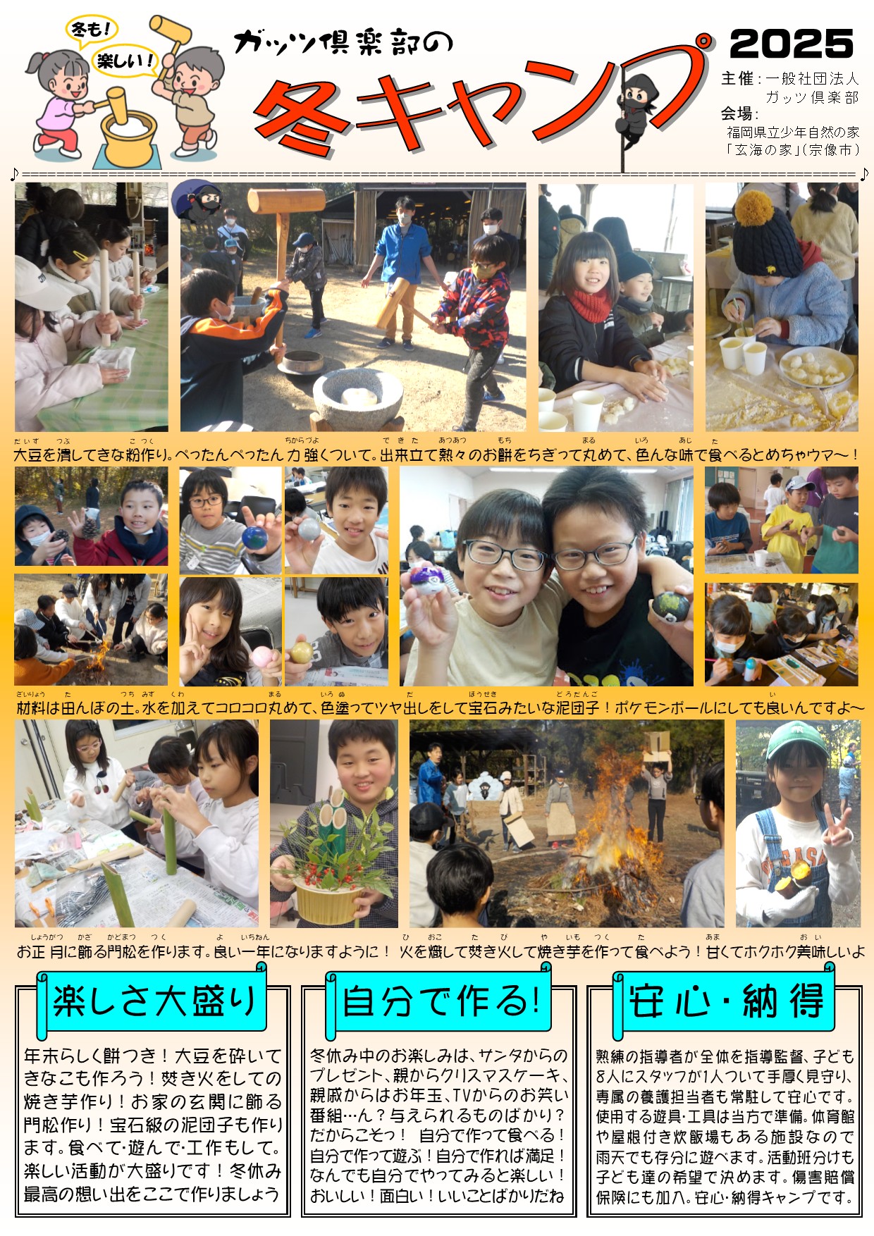 ◎人気プログラムがてんこ盛り・・・餅つきや門松作りといった「日本の年末年始の伝統的行事」をメインに据えつつ、弊社の土台ともいうべき通年イベント《ガッツ倶楽部の自然教室》から子ども達に大人気のプログラムを選りすぐって盛り合わせにしたのがこの冬キャンプです。笑顔とワクワクとガッツと感動で過ごす1泊2日です。